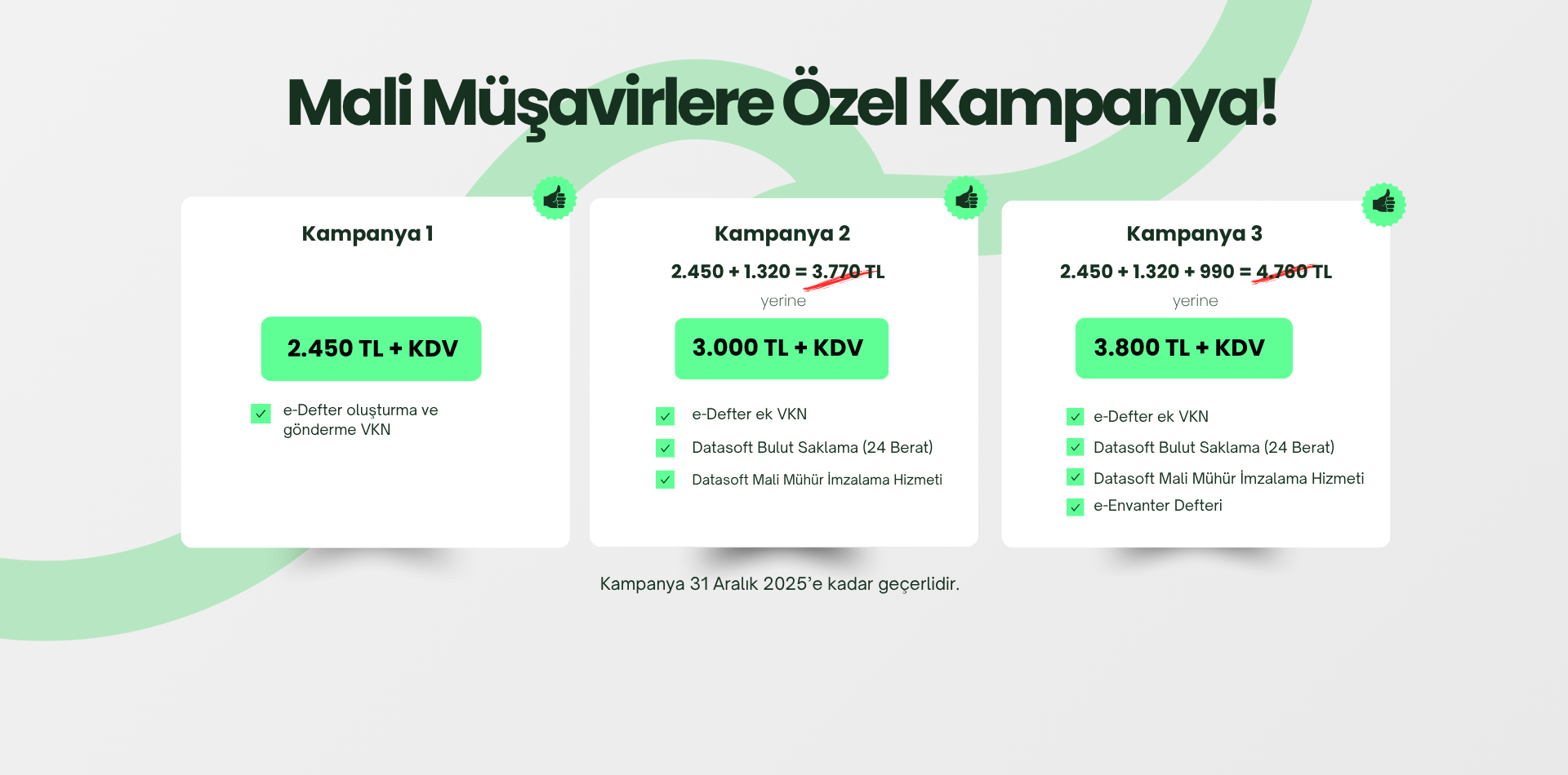 31.12.2024 tarihine kadar; e-Defter Lisansı (Yıllık 1 VKN) + Datasoft Bulut Saklama (24 Berat) + Datasoft Mali mühür İmzalama = 2400 TL+KDV Dileyen mali müşavirlerimiz platform bağımsız e defter gönderme hizmetini kullanarak farklı muhasebe programlarında oluşturdukları defterleri gönderebilirler. *2025 mali yılı için geçerlidir.