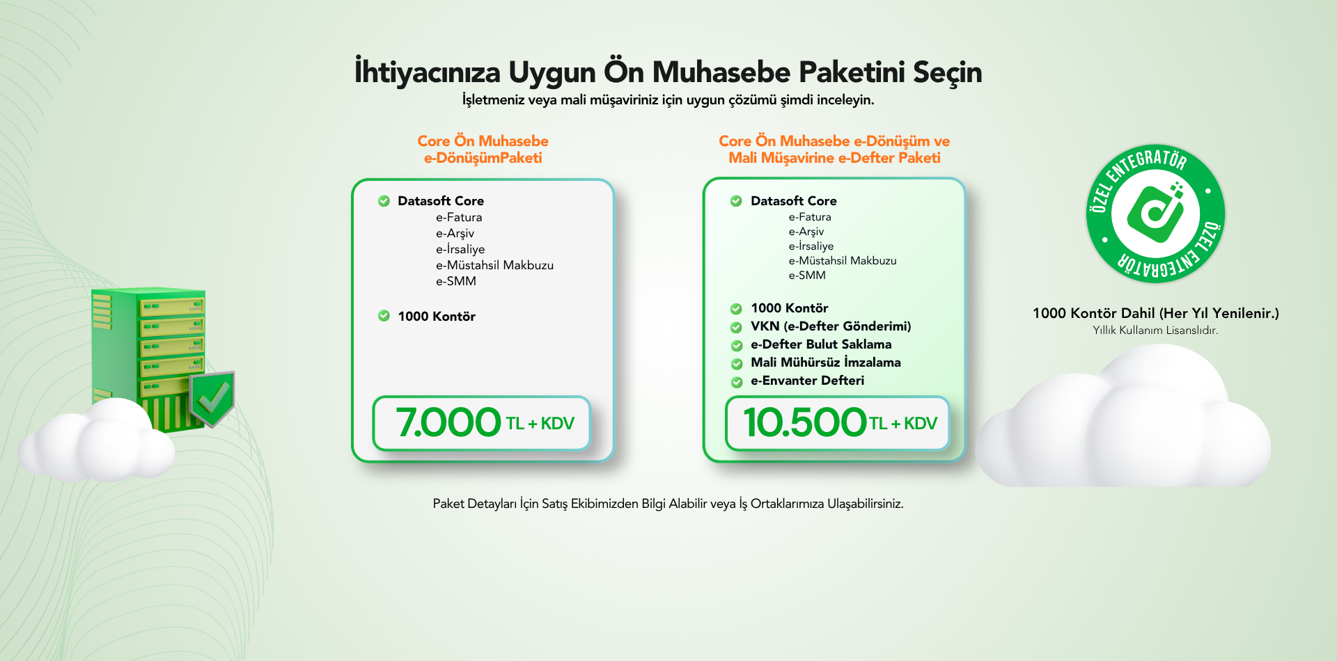 31.12.2024 tarihine kadar; DATASOFT BULUT ÖN MUHASEBE (CORE) + 300 e-belge kontörü + e-Defter Lisansı (Yıllık 1 VKN) + Datasoft Bulut Saklama (24 berat) + Datasoft Mali Mühür imzalama 7000 TL+KDV *Yeni kullanıcılar için geçerlidir *2025 mali yılı için geçerlidir.